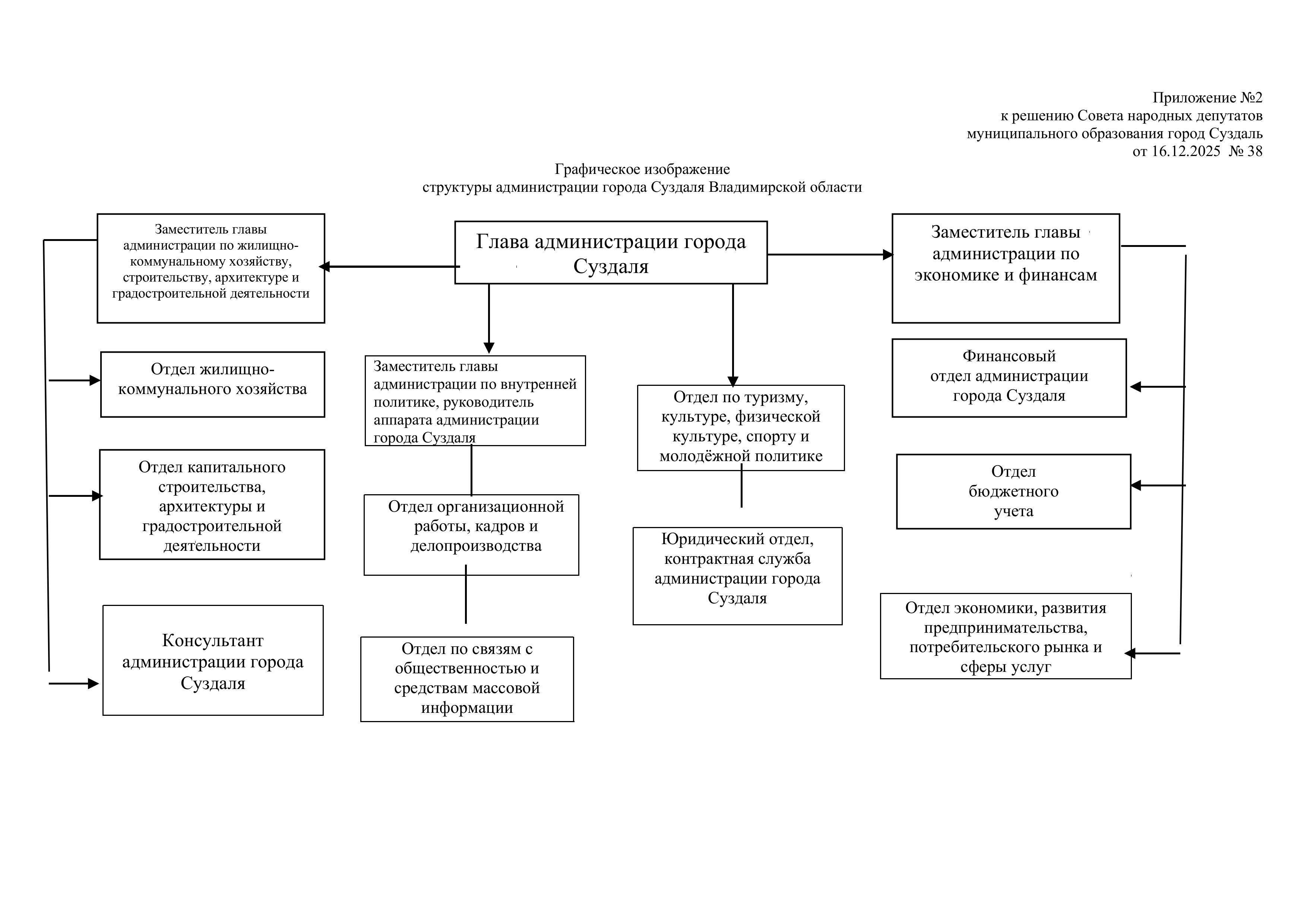 Структура администрацииСтруктура администрации города Суздаля утверждена решением Совета народных депутатов муниципального образования город Суздаль от 16.12.2025 № 38 О внесении изменений в приложения к решению Совета народных депутатов города Суздаля от 20.02.2024 года № 07 «Об утверждении структуры администрации города Суздаля Владимирской области» Читать. Графическое изображение структуры администрации города Суздаля Владимирской области